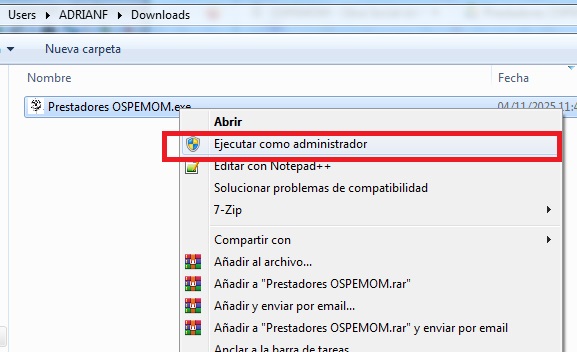 5- Y si no desde la carpeta de descargas, buscar el archivo y hacer click con el botón derecho del Mouse sobre el ejecutable "Prestadores OSPEMOM.exe", se abrirá el siguiente menú contextual y hacer click en Ejecutar como Administrador.