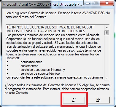 9- Hacer click en "Si" para instalar Microsoft Visual C++ que permite la compatibilidad con windows 10 y 11.