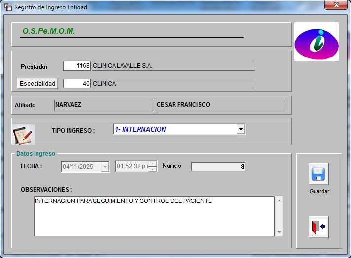 6- Puede registrar el ingreso del paciente como Ambulatorio o Internado para dejar un antecedente.