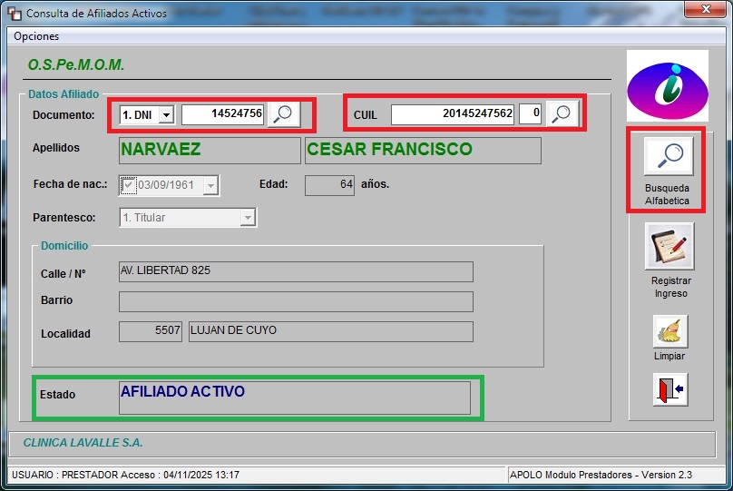 5- Para consultar el estado de un Afiliado de la Obra Social, puede realizar la búsqueda por:
